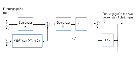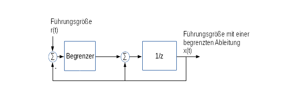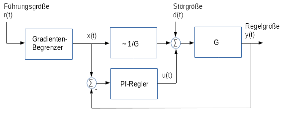 Ein Gradienten-Regler besteht aus einem Gradientenbegrenzer und einem nachgeschalteten Regler. Der Gradientenbegrenzer begrenzt ein oder zwei Ableitungen der Führungsgröße. Das kann verwendet werden, um z.B. bei Sprüngen in der Führungsgröße den Komfort einer Geschwindigkeitsregelung zu verbessern oder den Verschleiß eines Antriebs zu reduzieren. Der Regler für die Regelstrecke G ist hier ein PI-Regler mit Vorsteuerung.