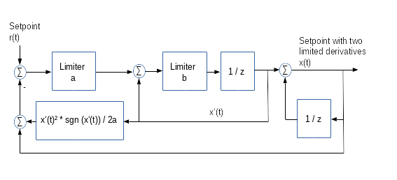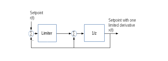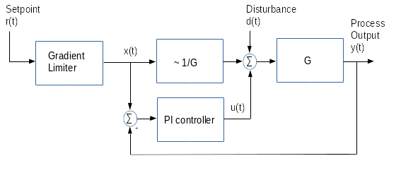 A gradient controller is a composite of a gradient limiter and a following feedback controller. The gradient limiter limits one or two derivatives of the setpoint. This may be used for a comfort increase of a speed controller or to reduce the wear of a power drive. Here the feedback controller for the process G is a PI controller with feed forward of the setpoint.